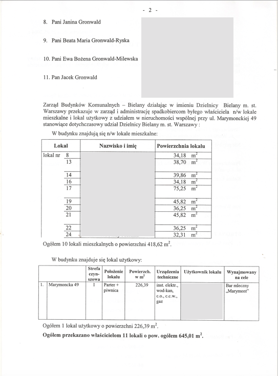 W dalszej części dokumentu Biuro Gospodarki Nieruchomościami przedstawia listę postępowań spadkowych i wynikającą z nich listę spadkobierców, którym nieruchomość należy zwrócić. (całość dokumentu w artykule: Miasto od 20 lat potwierdza prawa właścicielskie spadkobierców, ale nie wydaje decyzji co do gruntu)