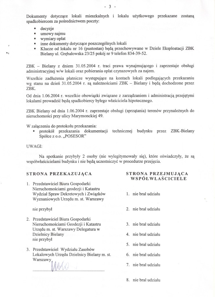 Przekazanie dokumentacji w formie protokołu przekazania nastąpiło pocztą wraz z uzasadnieniem powołującym się na paragrafy, że tego typu przekazanie jest skuteczne i że na właścicielach ciąży teraz obowiązek administrowania nieruchomością i pobierania czynszów na należące do nich lokale niewydzielone, a co z tego wynika – odpowiedzialność za regulowanie opłat za te lokale, ich remontów itp; oraz współzarządzenie częściami wspólnymi.