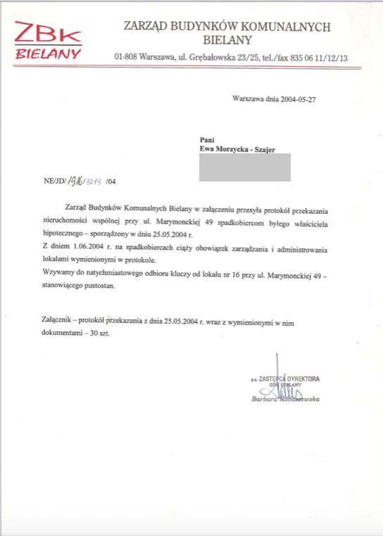 Tak więc w 2004r. spadkobiercy chcąc nie chcąc, odebrali klucze oraz resztę dokumentacji z BGN, innymi słowy przyjęli część nieruchomości zwróconą przez miasto (z zajmującymi lokale niewydzielone, wrogo do zmiany nastawionymi lokatorami komunalnymi) i podjęli się zarządzania nią. I próbują się wywiązywać z tych obowiązków do dnia dzisiejszego, mimo coraz większych trudności, które są przed nimi piętrzone ze wszystkich możliwych stron.