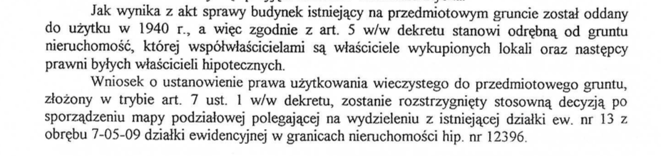 Uzasadnienie decyzji zwrotu znaleźć można w poniższym piśmie wystosowanym przez wydział prawny Miasta do Sądu Rejonowego dla Warszawy Żoliborza (Sygn. akt: II Ns 321/09):
