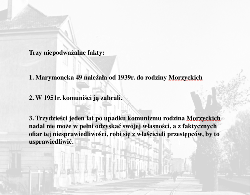 3. Trzydzieści jeden lat po upadku komunizmu w Polsce rodzina Morzyckich nadal nie może w pełni odzyskać swojej własności, a z faktycznych ofiar tej niesprawiedliwości, robi się z właścicieli przestępców, by to usprawiedliwić.