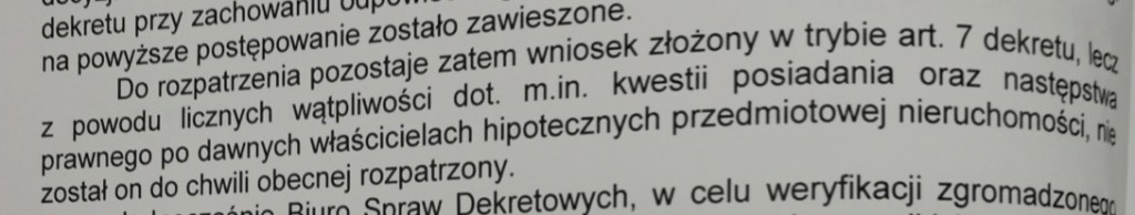 Dalej czytamy: “Do rozpatrzenia pozostaje zatem wniosek złożony w trybie art.7 dekretu (chodzi o wniosek w sprawie gruntu złożony przez właścicieli 2001r.), lecz z powodu licznych wątpliwości dot. m.in. kwestii posiadania oraz następstwa prawnego po dawnych właścicielach hipotecznych przedmiotowej nieruchomości, nie został on do chwili obecnej rozpatrzony.”