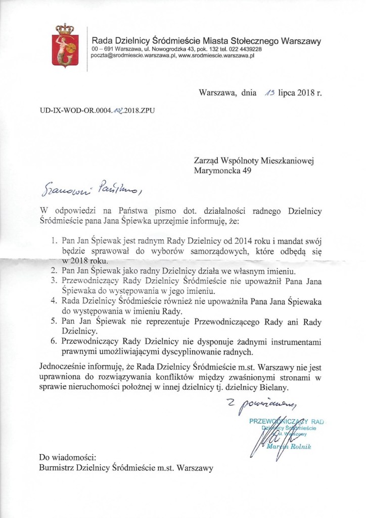 Jedynie Zarząd Wspólnoty Mieszkaniowej otrzymał pojedyncze odpowiedzi, wszystkie wymijające czy, jak ta poniższa, z serii “umywamy ręce”: “Jan Śpiewak jako radny Dzielnicy działa we własnym imieniu”.