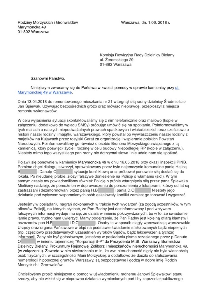 24 lipca 2018r., czyli 8 dni po sławnej konferencji prasowej Śpiewaka, na której ujawnił swoje “odkrycia” dotyczące Marymonckiej 49, Biuro Spraw Dekretowych wysłało do Tomasza Menciny, Burmistrza Dzielnicy Bielany, kuriozalne pismo (SD-WS-I.6841.335.2017.IPO), w którym najczęściej powtarzanym słowem są “wątpliwości”. Na podstawie tych “wątpliwości”, które nagle po 20 latach ich braku, zrodziły się całkiem przypadkiem w Biurze Spraw Dekretowych właśnie w lipcu 2018r., kiedy media huczały od rewelacji Śpiewaka, Biuro “wnosi o rozpatrzenie możliwości odebrania zarządu i administracji spadkobiercom byłych właścicieli budynku położonego w Warszawie przy ul. Marymonckiej 49.”!