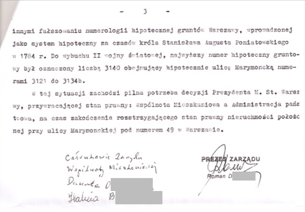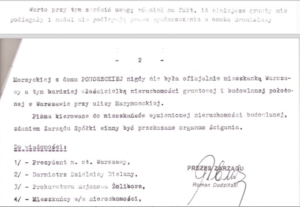 A z drugiego z tych pism dowiadujemy się z kolei, że to “osoba Bronisławy Morzyckiej z domu Pohoreckiej nigdy nie była oficjalnie mieszkanką Warszawy, a tym bardziej właścicielką nieruchomości gruntowej i budowlanej położonej w Warszawie przy ulicy Marymonckiej.”