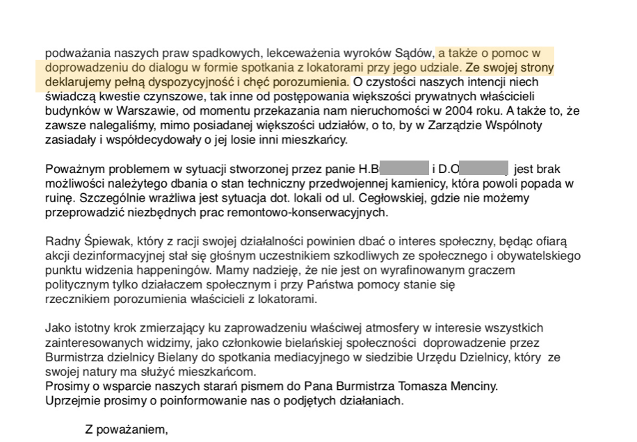 W tym celu w czerwcu 2018r. napisali wiele pism do różnych organów administracji warszawskiej m.in. do Komisji Rewizyjnych Rady Dzielnicy Śródmieście i Rady m.st.Warszawy, i do Burmistrzów obu dzielnic. Głównym przesłaniem tych pism była prośba “o pomoc w doprowadzeniu do dialogu w formie spotkania z lokatorami przy udziale Jana Śpiewaka” poprzez zorganizowanie “spotkania mediacyjnego w siedzibie Urzędu Dzielnicy”. W tym samym mniej więcej czasie pisma do Miasta, również z prośbą o mediacje i pomoc w celu rozwiązania konfiktu, wystosował legalny Zarząd Wspólnoty, a także oburzeni właściciele Baru Marymont. W sumie urzędy otrzymały w tym maju i czerwcu 2018r. ok. 30 pism w tej sprawie.