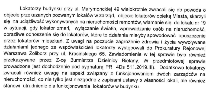 Tymczasem przeglądając w 2019r. dokumentację dot. Marymonckiej 49 w Biurze Spraw Dekretowych właściciele odkryli, że Rada Miasta spotkała się… z Danutą O. i innymi lokatorami komunalnymi w sprawie nieruchomości – nie zapraszając na to spotkanie prawowitych właścicieli kamienicy! Nie zaproszono też ich później, żeby mogli ewentualnie odpowiedzieć na zarzuty przedstawione im przez Danutę O. i jej popleczników. Ewidentnie nie była to próba sprawiedliwej oceny stanu faktycznego, a wyłącznie… zbieranie jednostronnych argumentów do pozwu przeciwko właścicielom o eksmisję ich z zajmowanych lokali, który Miasto najwyraźniej już wtedy szykowało. Jedynie post factum, z tego właśnie pozwu, możemy się domyślać, jakie pomówienia tam padły, ponieważ w pozwie znalazł się cały ustęp pt. ASPEKT SPOŁECZNY, a w nim czytamy m.in.: