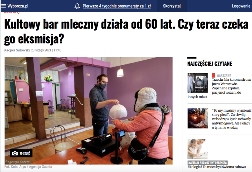 W Wyborczej.pl pojawił się w dniu dzisiejszym artykuł: Kultowy bar mleczny działa od 60 lat. Czy teraz czeka go eksmisja?